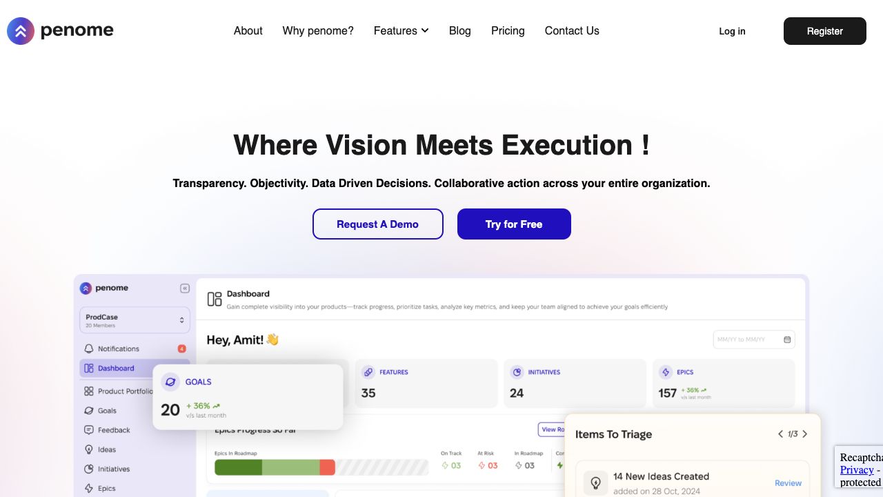 Penome helps you define goals, identify levers that move the needle, gather feedback, manage ideas, and prioritize epics using data-driven insights and AI. You can create products, assign PMs, manage features, and build collaborative roadmaps.