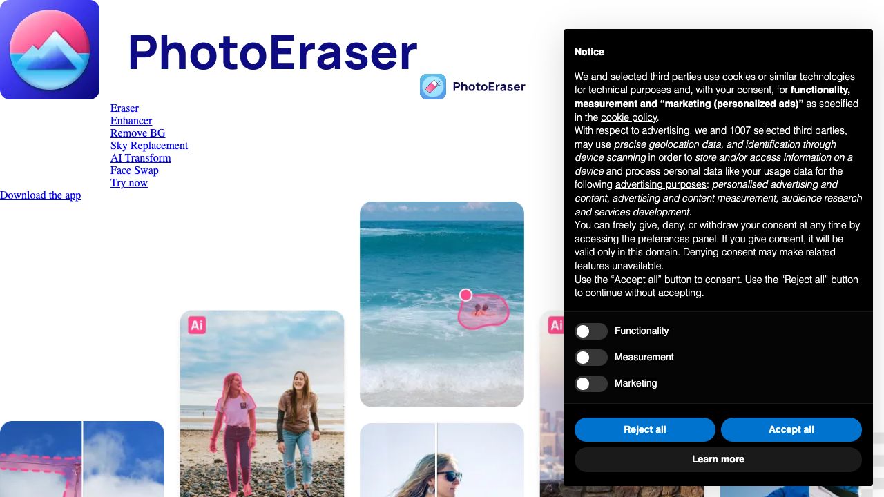 Photo Eraser is an AI Photo Editor that enhances picture quality, removes unwanted objects, and adds new elements effortlessly. It offers tools like Eraser, Enhancer, Remove BG, Sky Replacement, AI Transform, and Face Swap. It's available as a web app and an iPhone app.