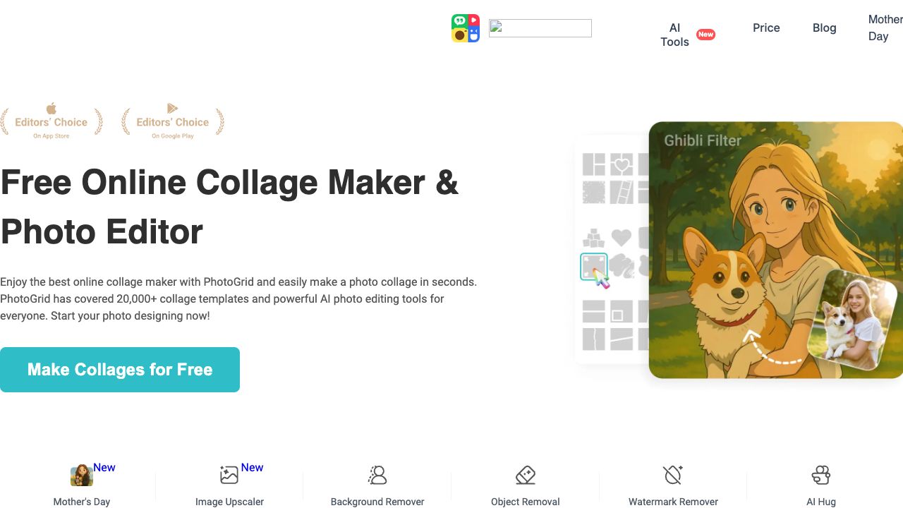 PhotoGrid is an online collage maker and AI photo editor that allows users to create stunning photo collages with over 20,000 layout templates. It offers tools to easily make photo collages with text, effects, stickers, backgrounds, and AI-powered features like background remover, object remover, image upscaler, and more. It also provides an all-in-one photo editor to crop, resize, and adjust images, along with creative AI filters.