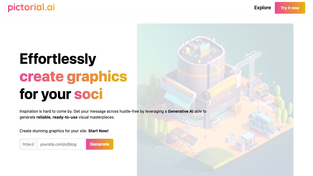 Pictorial is a Generative AI application designed to effortlessly create graphics for web applications. It helps users overcome creative blocks by generating reliable, ready-to-use visual masterpieces. The AI extracts ideas, concepts, and intentions from a website's URL to create useful visuals. Users can choose from a variety of options and guide the AI by iterating or generating alternatives to the designs created.