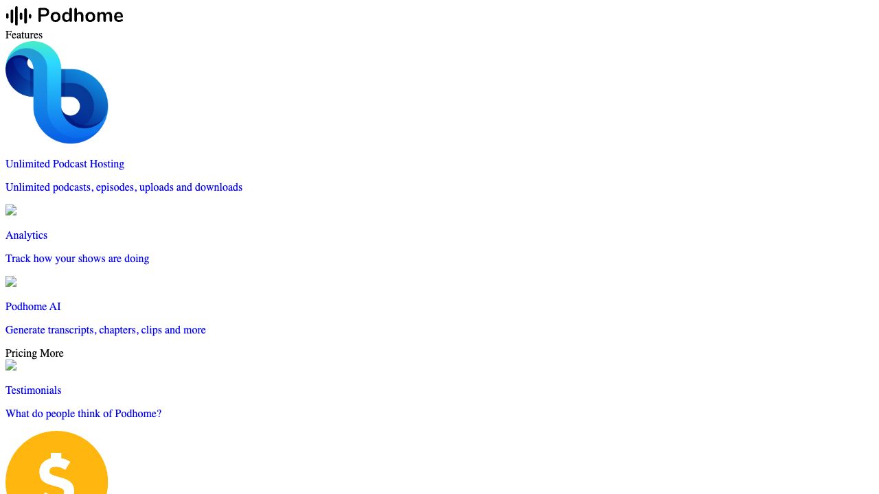Podhome is a modern podcast hosting and distribution platform offering unlimited shows, episodes, uploads, and downloads for a monthly price. It includes features like dynamic audio & text, a website per show, and Podhome AI to automatically generate transcripts, chapters, clips, show-notes, and titles. Podhome also provides analytics, easy distribution to podcast directories, audio enhancement, team collaboration tools, embeddable players, and support for Podcasting 2.0 features.