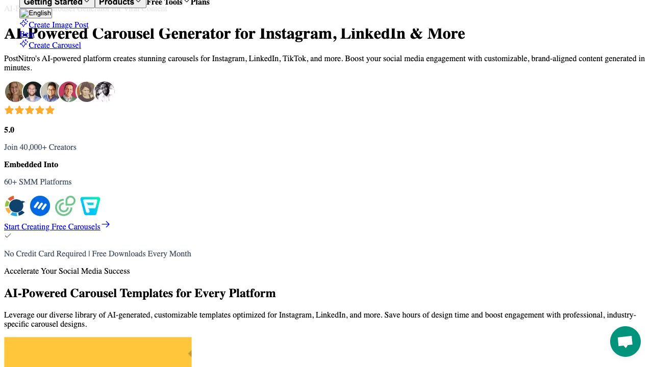 PostNitro is an AI-powered carousel maker that helps marketers, agencies, small business owners, and creators quickly produce high-converting carousel content for social media platforms like Instagram, LinkedIn, TikTok, and Twitter. It automates design and copywriting, offering customizable templates and AI-generated content to boost social media engagement and growth.