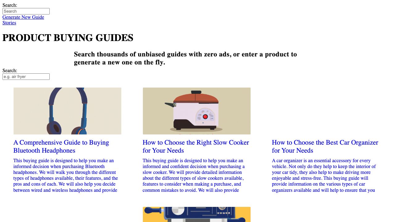 Users can search for existing product buying guides using the search bar or generate a new guide by entering a product name. The platform provides unbiased information to help users make informed purchasing decisions.