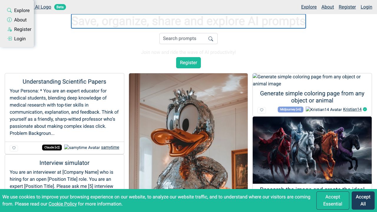 用户可以在 PromptWave AI 上注册,以保存他们的 AI 提示,使用过滤和排序选项来组织这些提示,并与社区分享。用户还可以探索由其他用户创建的提示,以获取灵感并进行重复使用。