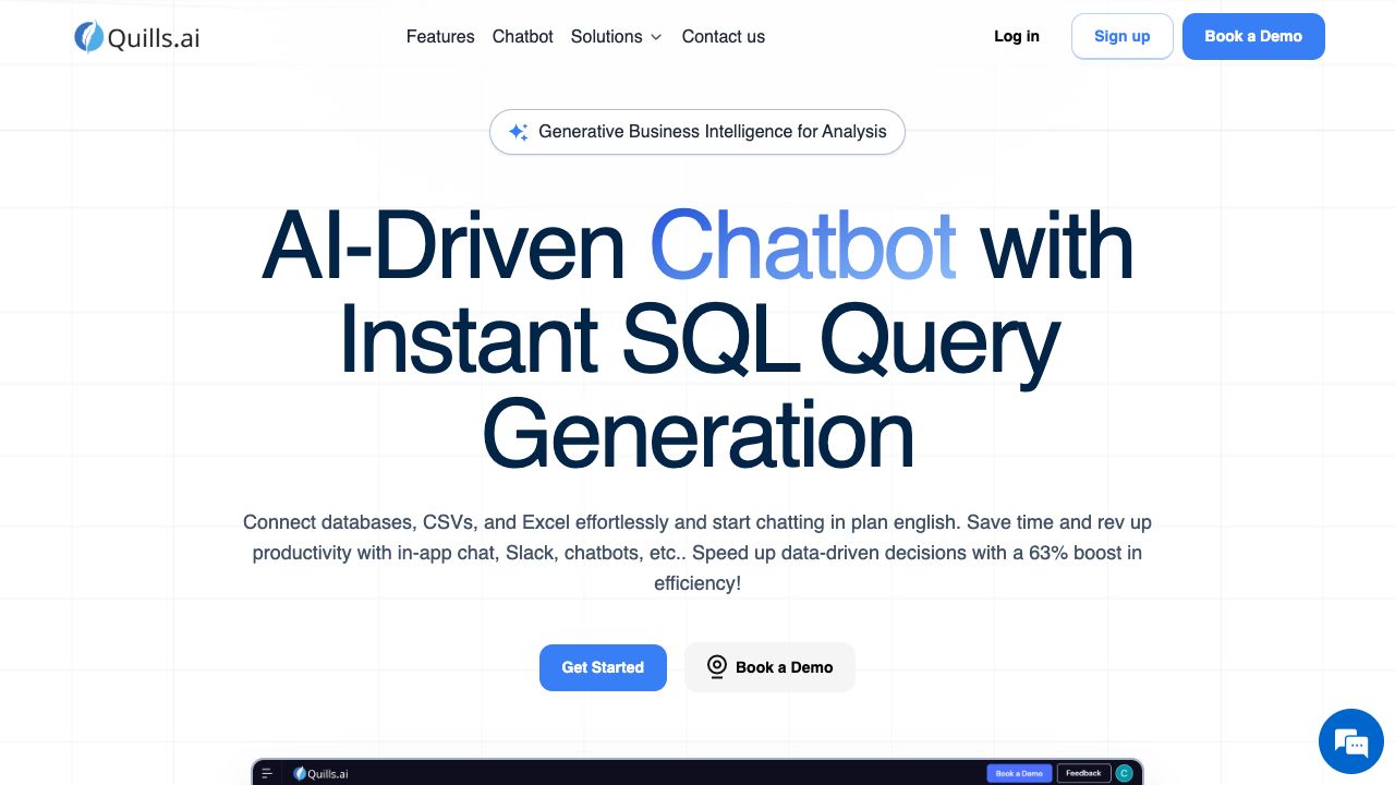 将您的数据库、CSV 文件或 Excel 文件连接到 Quills.ai。然后,通过自然语言与您的数据互动。您可以提问、生成 SQL 查询、可视化数据并导出结果。