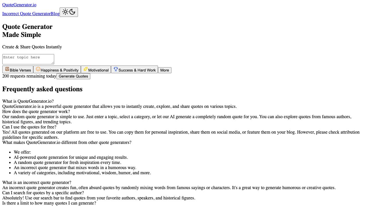 QuoteGenerator.io is a powerful quote generator that allows you to instantly create, explore, and share quotes on various topics. It offers AI-powered quote generation, a random quote generator, and an incorrect quote generator for humorous results. Users can search for quotes by specific authors and share them on social media.