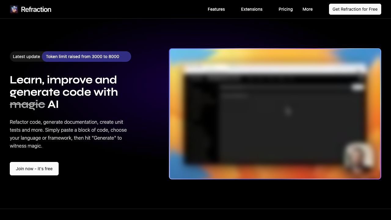 Refraction is a code generation tool for developers that uses AI to generate unit tests, documentation, refactor code, and more. It supports 56 languages, including C#, C++, Go, Java, JavaScript, PHP, Python, R Lang, Ruby, Swift, and TypeScript. Users can paste a block of code, choose their language, and generate code-related tasks using AI.