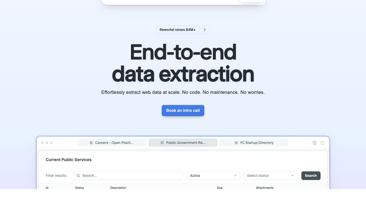 Reworkd automates the entire web data pipeline, end-to-end. It scans websites, generates code, runs extractors, validates results, and outputs data—all from one simple system.