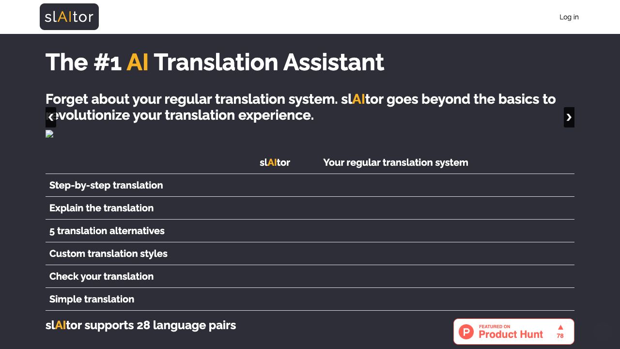 slAItor is an AI translation assistant powered by GPT. It's a new kind of translation engine that leverages recent advances in artificial intelligence. It can explain a translation step-by-step, adjust the style of a translation, generate up to 5 translation alternatives, and spot/explain errors in your own translations.