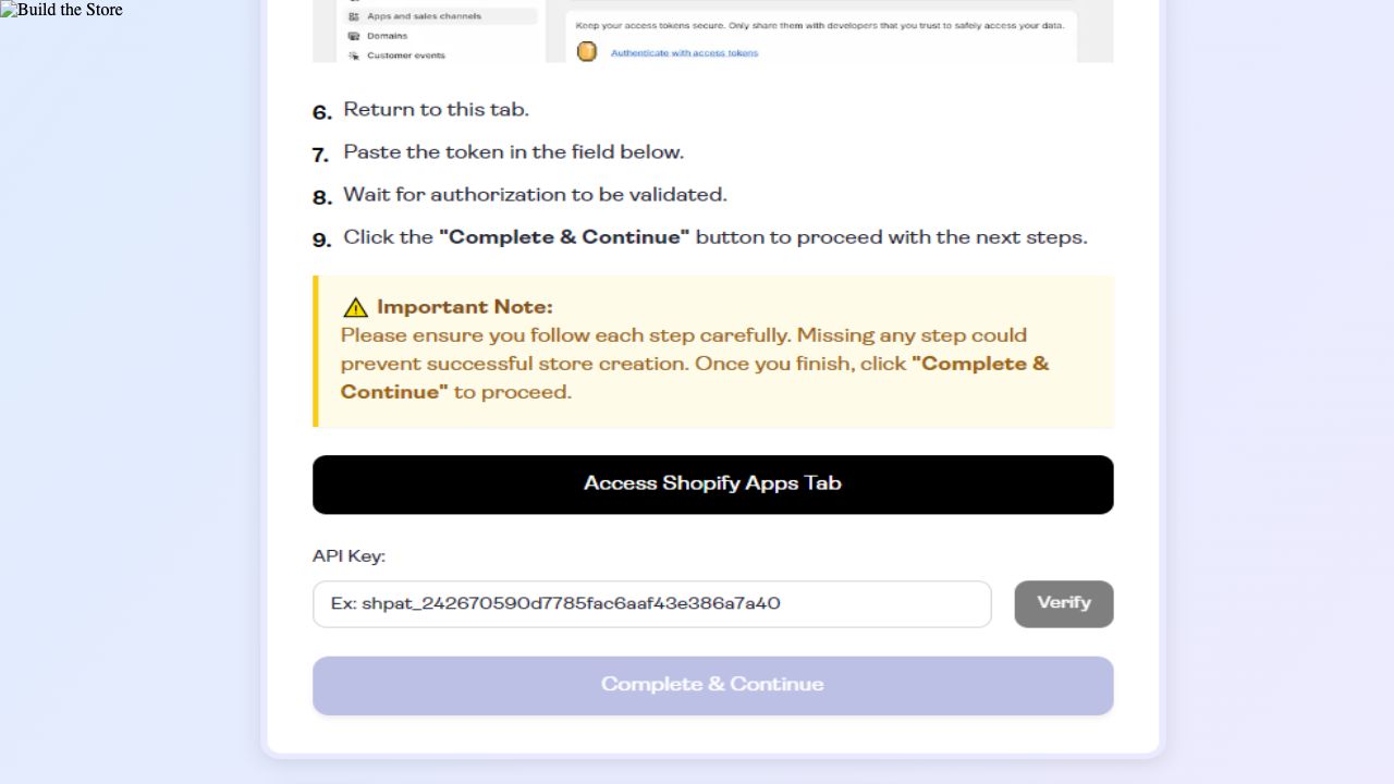 1. Choose a niche. 2. Input logo text. 3. Create a Shopify account. 4. Link your Shopify store. 5. Input Shopify API Key. 6. Build the store.