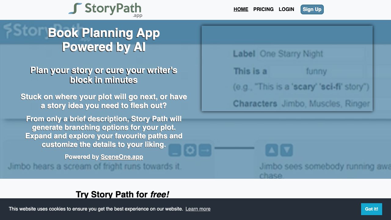 StoryPath.app is an AI-powered book planning app designed to help writers overcome writer's block and plan their stories. It generates branching plot options from brief descriptions, allowing users to explore and customize their narratives. The app aims to condense random story ideas into coherent narratives, enabling writers to start their novels more quickly.
