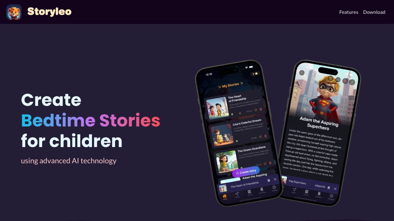 Storyleo is a specially designed app for parents and their children that uses AI to create engaging and unique bedtime stories. Each story is customized to captivate the child's imagination, creating a truly unique experience. The app allows parents to choose from different characters and themes, and the stories can be transformed into audiobooks.