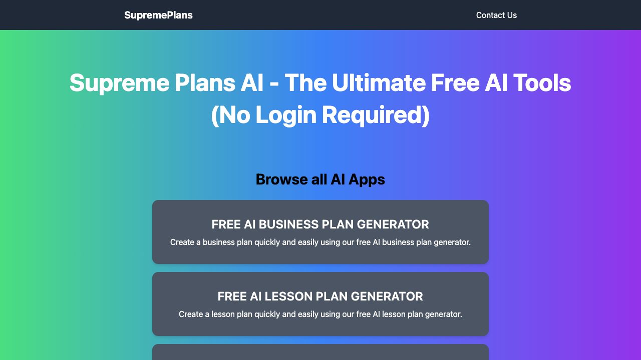 Supreme Plans is a website that offers free AI-generated plans in various categories, including business, lesson, meal, and travel. Users can input their needs, and the AI will create detailed, personalized plans. It also provides AI-powered tools for generating rap lyrics and other creative content.