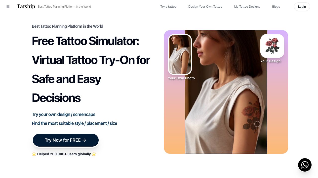 Tatship is a platform that offers a virtual tattoo try-on experience, allowing users to simulate and preview tattoos on their bodies before committing to permanent ink. It provides tools for uploading images, choosing or generating tattoo designs, and visualizing how they look on different body parts. Tatship aims to help users make informed decisions, avoid regrets, and effectively communicate their tattoo ideas to artists.