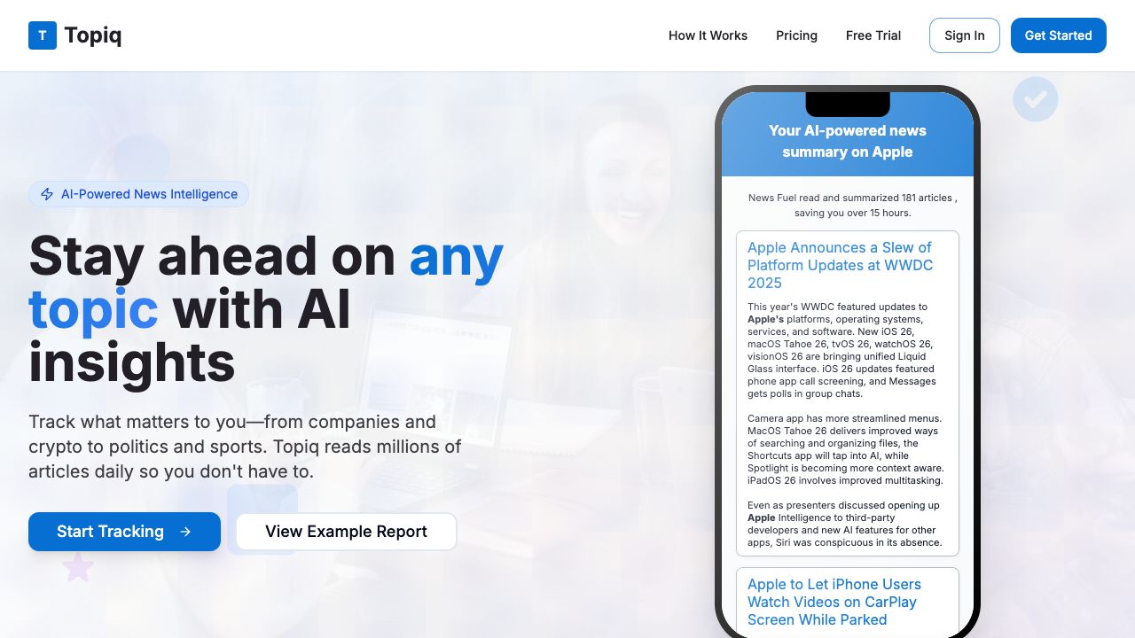 TOPIQ is an AI-powered SaaS platform that tracks news on any company. It aggregates news from more than 4 million articles per day, creates concise summaries, and delivers them in daily emails. It is positioned as the leading AI News Summary Platform.