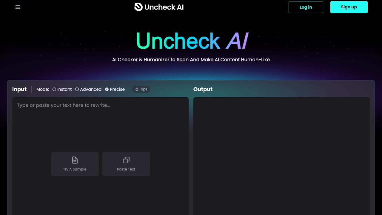 To use Uncheck AI, simply paste your AI-generated text into the input field, select the desired mode (Instant, Advanced, or Precise), and click 'Humanize'. The humanized output will then appear, ready for use.