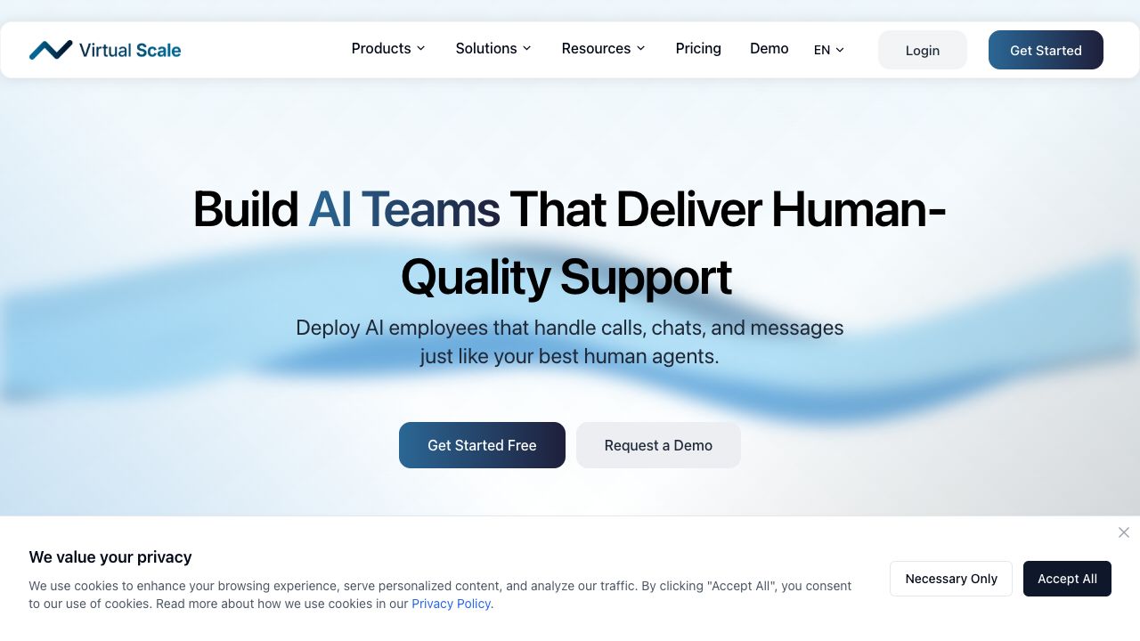 Virtual Scale is an automation platform that provides an infinite workforce of AI-powered employees that speak, type, and build a Client Profile from Every Interaction—Autonomously. It empowers businesses with AI-driven virtual teams, enhancing customer engagement across calls, chat, WhatsApp, SMS, and more—all from a single platform. Scale effortlessly with customizable AI agents tailored to your industry needs.
