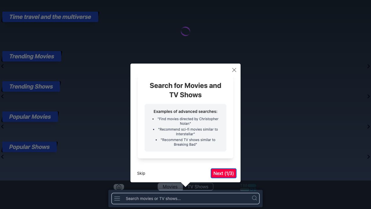 Use the search bar to find movies and TV shows or use advanced search examples like \"Find movies directed by Christopher Nolan\" or \"Recommend sci-fi movies similar to Interstellar\".