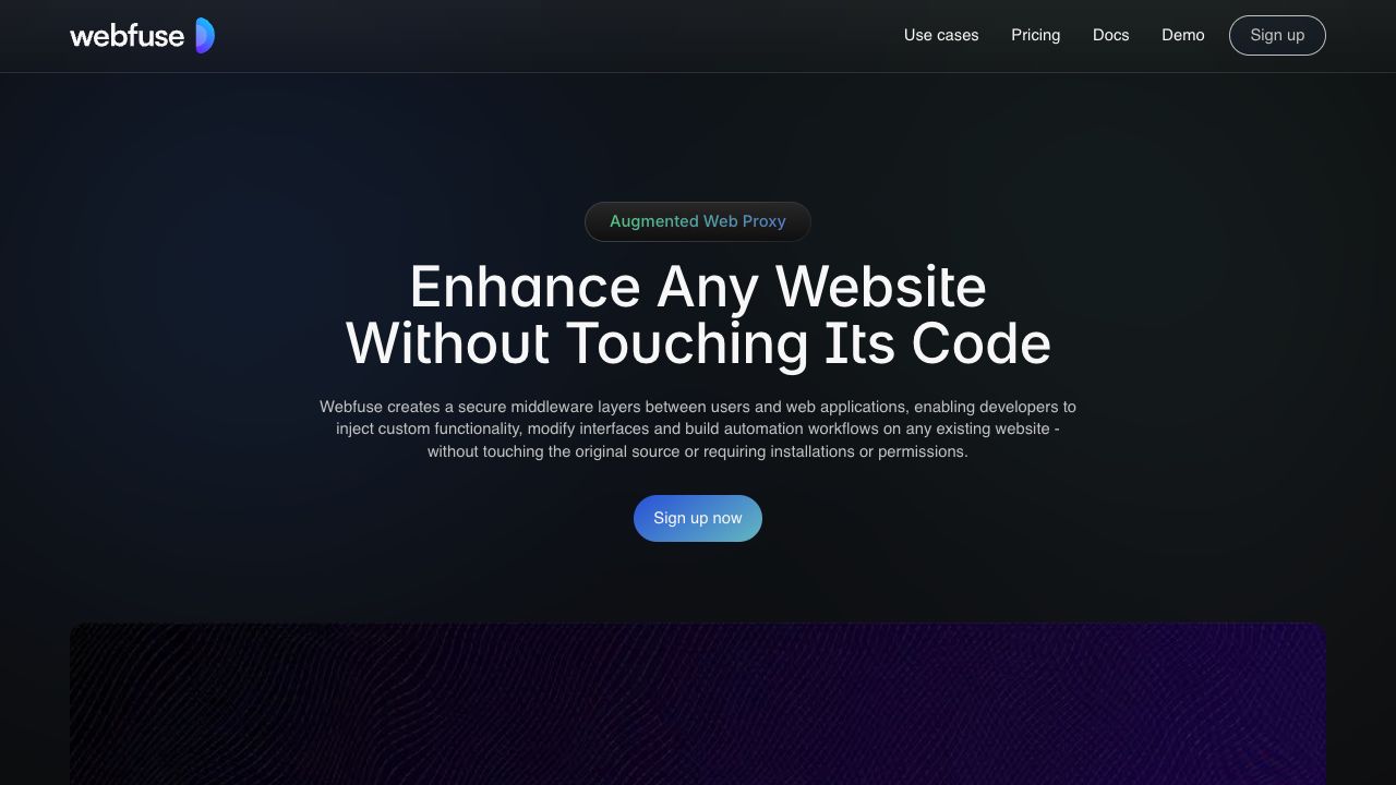 Webfuse is a web augmentation platform that allows users to modify, share, or audit any online interaction on any web application without requiring code or installation. It creates a secure middleware layer between users and web applications, enabling developers to inject custom functionality, modify interfaces, and build automation workflows on existing websites without altering the original source code or needing installations or permissions. Webfuse facilitates extending and customizing web experiences, enhancing security, enabling collaboration, and automating web journeys.