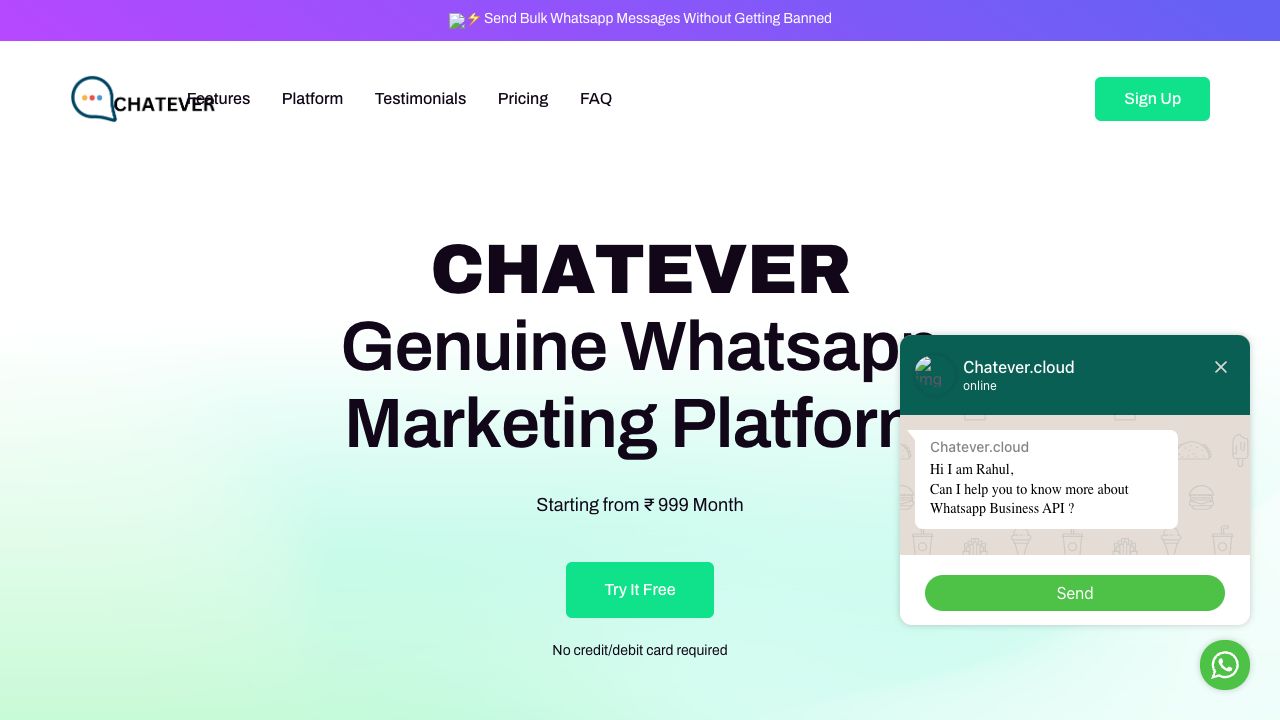 Chatever is a genuine WhatsApp marketing platform and WhatsApp Business API service provider in India. It provides AI-powered WhatsApp chatbot development services to businesses and government organizations. Chatever offers WhatsApp marketing and business automation through WhatsApp, including bulk WhatsApp messaging, chatbot development, and integration with CRM, ERP, and CMS systems.