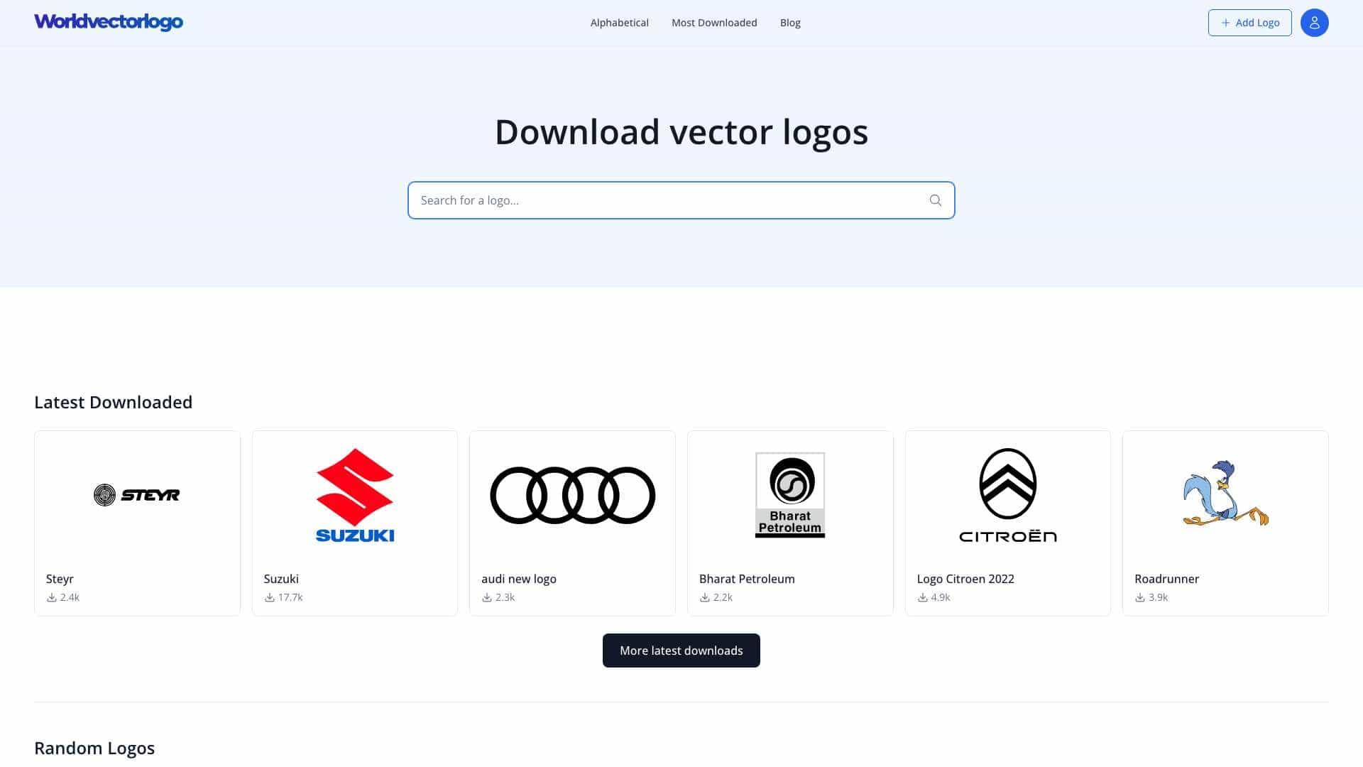 A platform for downloading vector logos of various brands, with latest and random logo options.