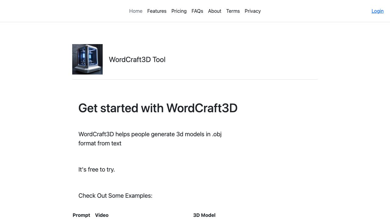 WordCraft3D Tool helps people generate 3D models in .obj format from text. Users can download mp4 videos of the object rotating, or the obj, mtl, and texture jpg for use in 3D games or websites. It's free to try.