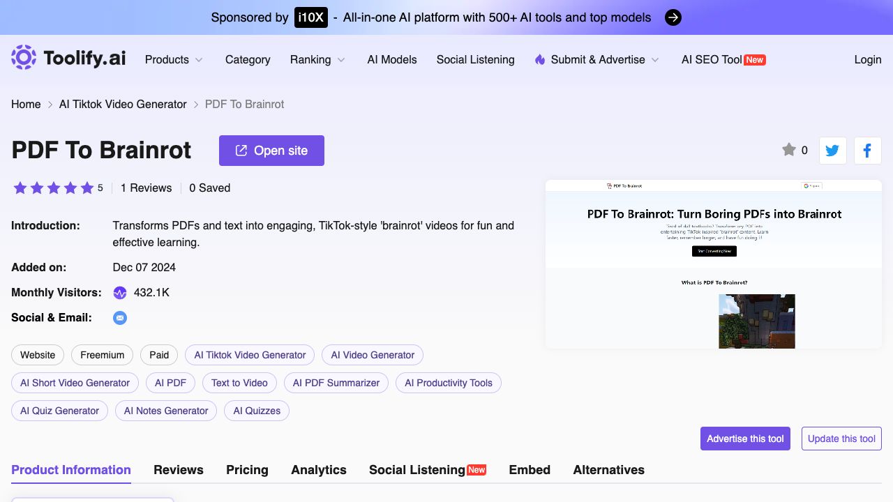 PDF To Brainrot is a revolutionary tool that converts dry, boring PDFs into engaging, TikTok-style 'brainrot' content. It transforms complex information into bite-sized, memorable snippets that resonate with the internet generation, making learning fun and effective. Users can convert any PDF or text into Brainrot Mode, Quiz Mode, or Raw Mode videos, customizing voice, narration, and background music.
