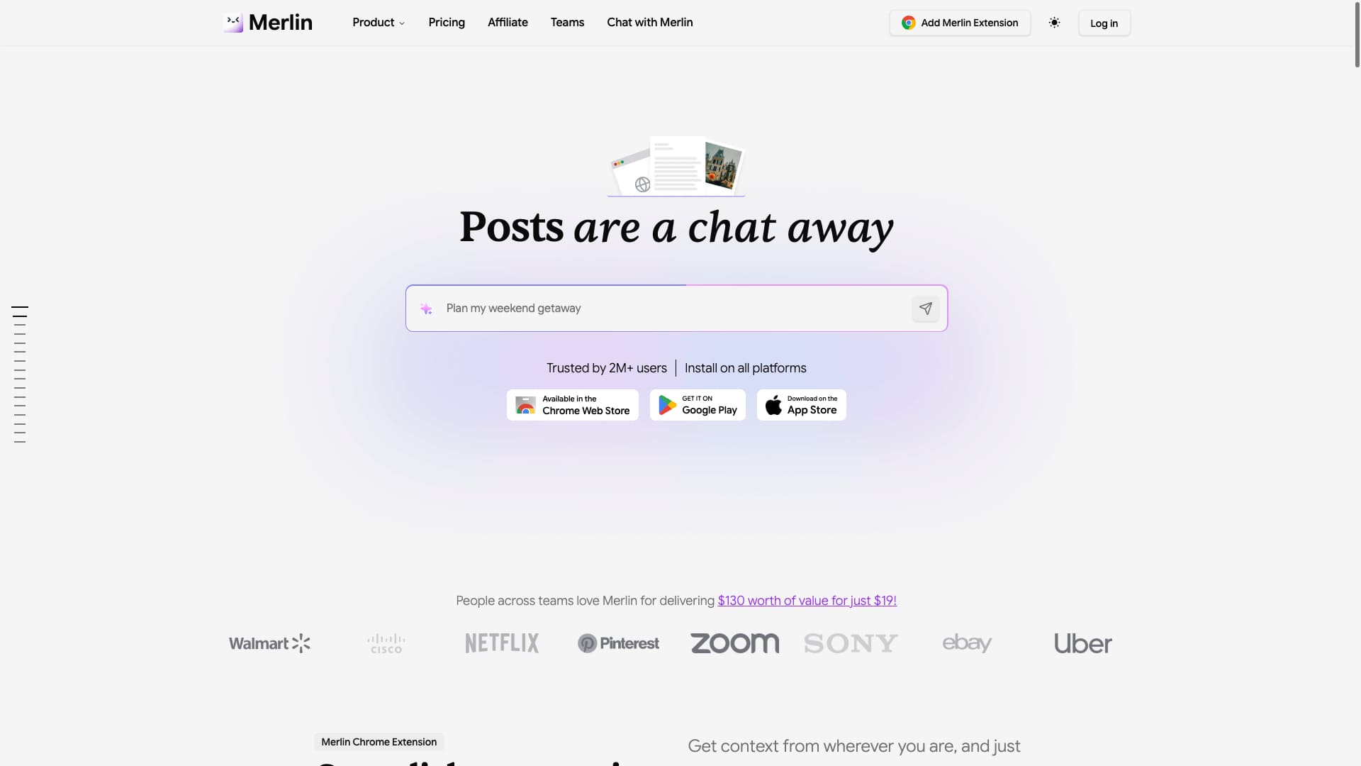 Install the Merlin AI Chrome Extension and use the shortcut Ctrl/⌘+M to open the AI Chatbot on any website. On platforms like Twitter, LinkedIn, YouTube, and Gmail, Merlin buttons provide easy access to its features.