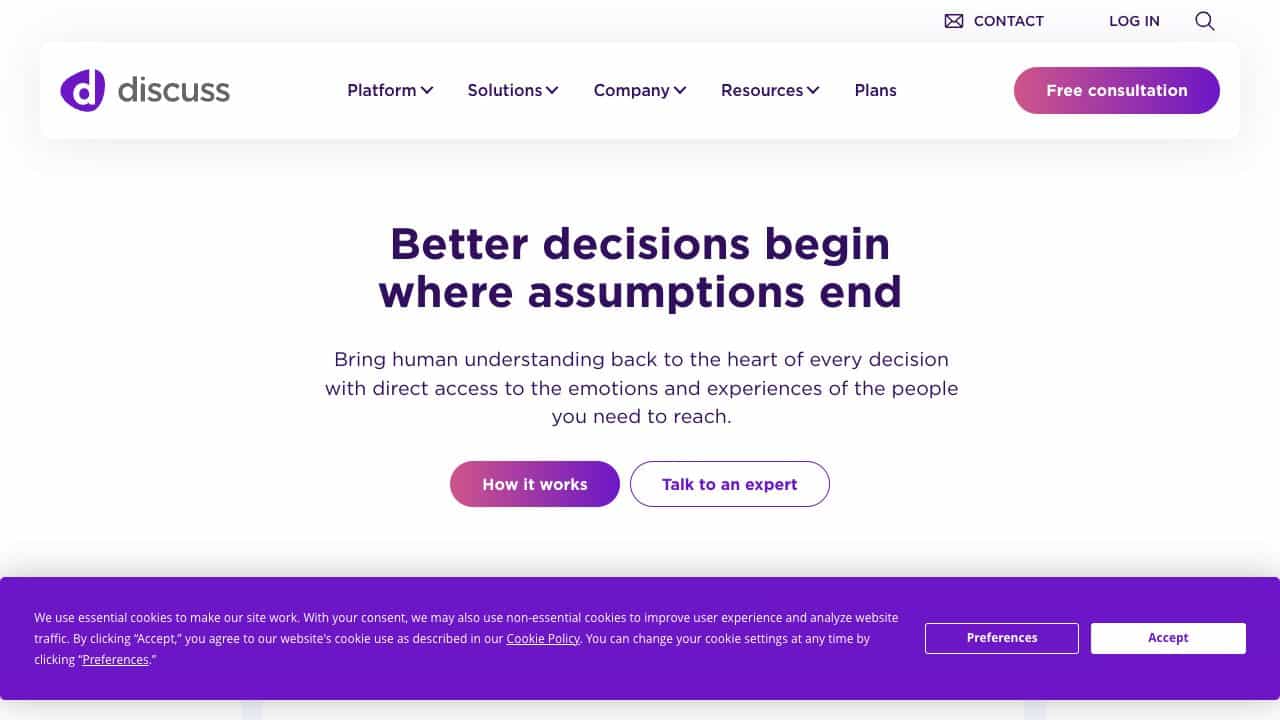 Use Discuss.io by accessing its web platform to conduct qualitative research, analyze data, and generate insights through integrated tools and dashboards.