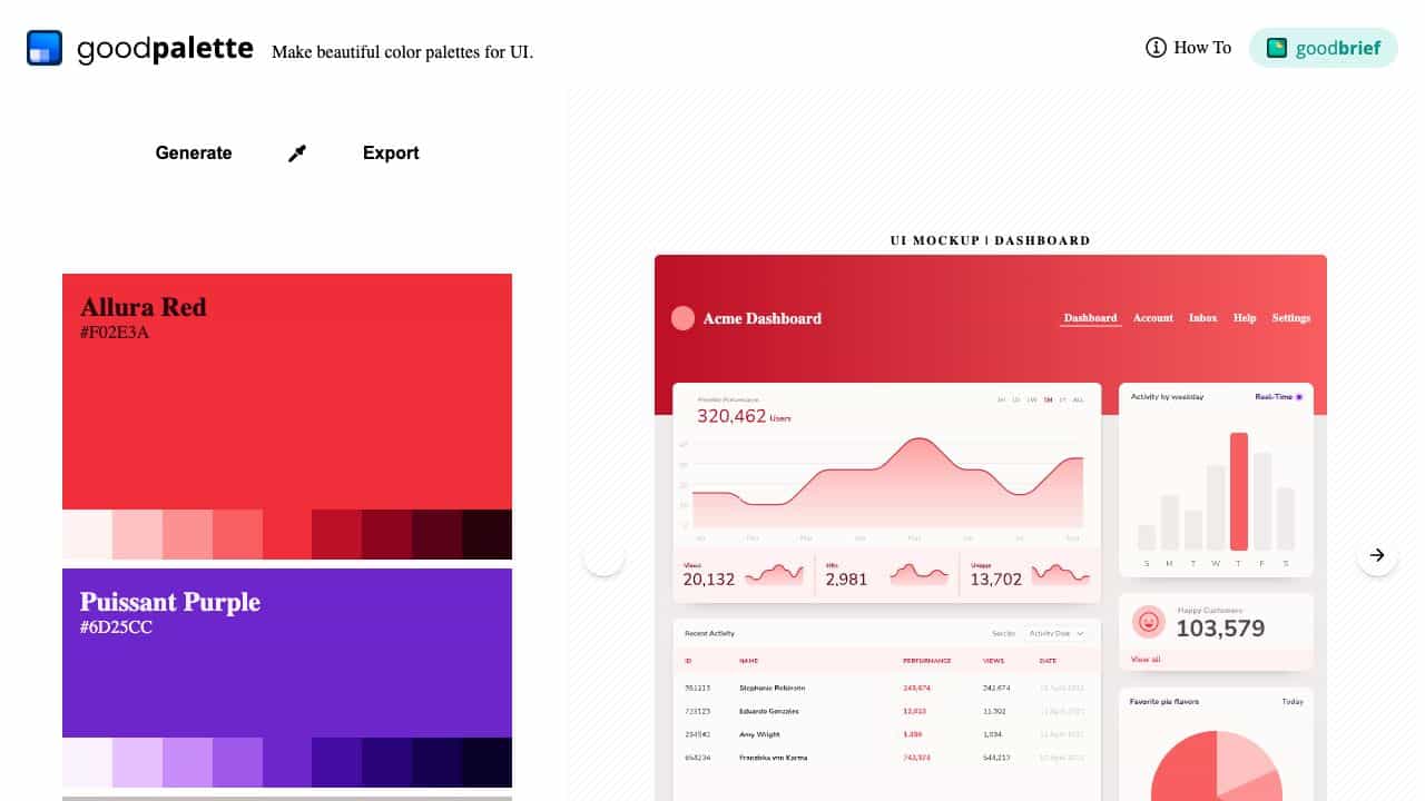 Use the tool to generate color palettes, check WCAG contrast, and preview them in dynamic mockups like dashboards.