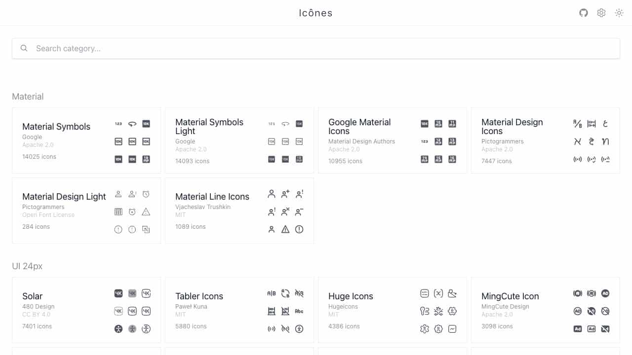 Icones is a web-based tool that aggregates and allows searching across multiple free icon libraries, including Material Symbols, Tabler Icons, and many others, providing easy access to high-quality icons for projects.