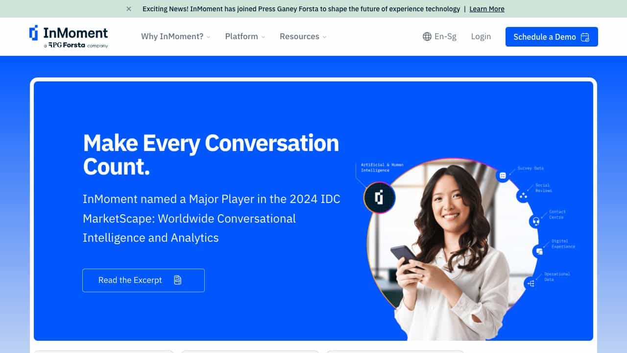 InMoment is a customer experience (CX) solution that integrates data, technology, and human expertise to help businesses collect feedback, analyze insights, and improve customer and employee experiences through AI-powered tools like text analytics and conversational intelligence.