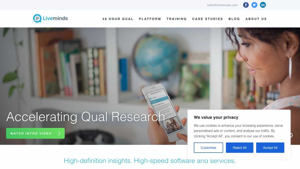 Liveminds is an online qualitative research platform offering 48-hour video qual services, mobile qual tools, and AI-accelerated pre-tasks, forums, and diaries to gather insights from participants worldwide.