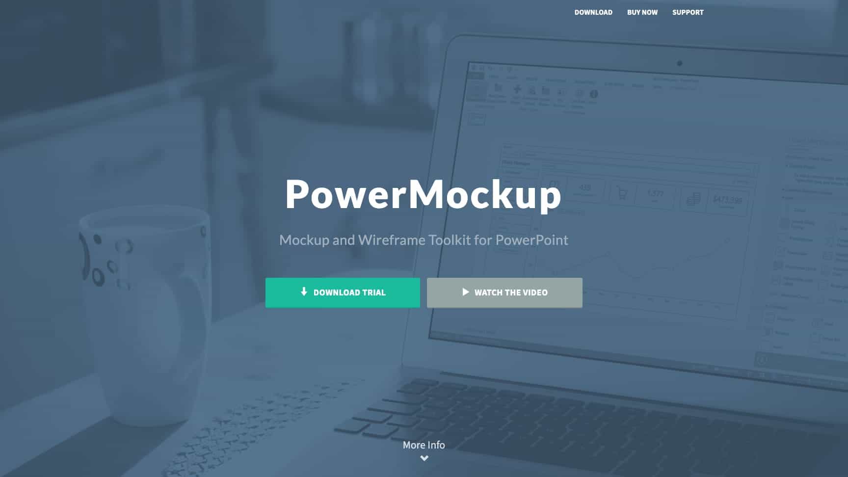 PowerMockup is a mockup and wireframe toolkit that integrates into PowerPoint, providing a library of shapes and icons to build screen prototypes without leaving the familiar PowerPoint environment.