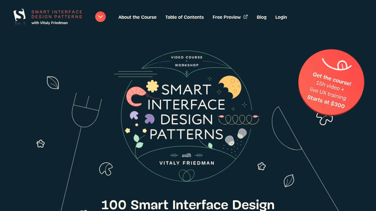 A comprehensive video course with 15 hours of content and live UX training, covering 100 smart interface design patterns for UI/UX designers and front-end developers.