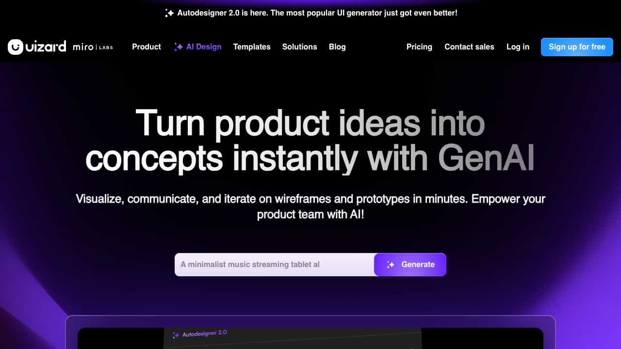 AI-powered UI design tool that generates wireframes, mockups, and prototypes from text prompts or screenshots in seconds.