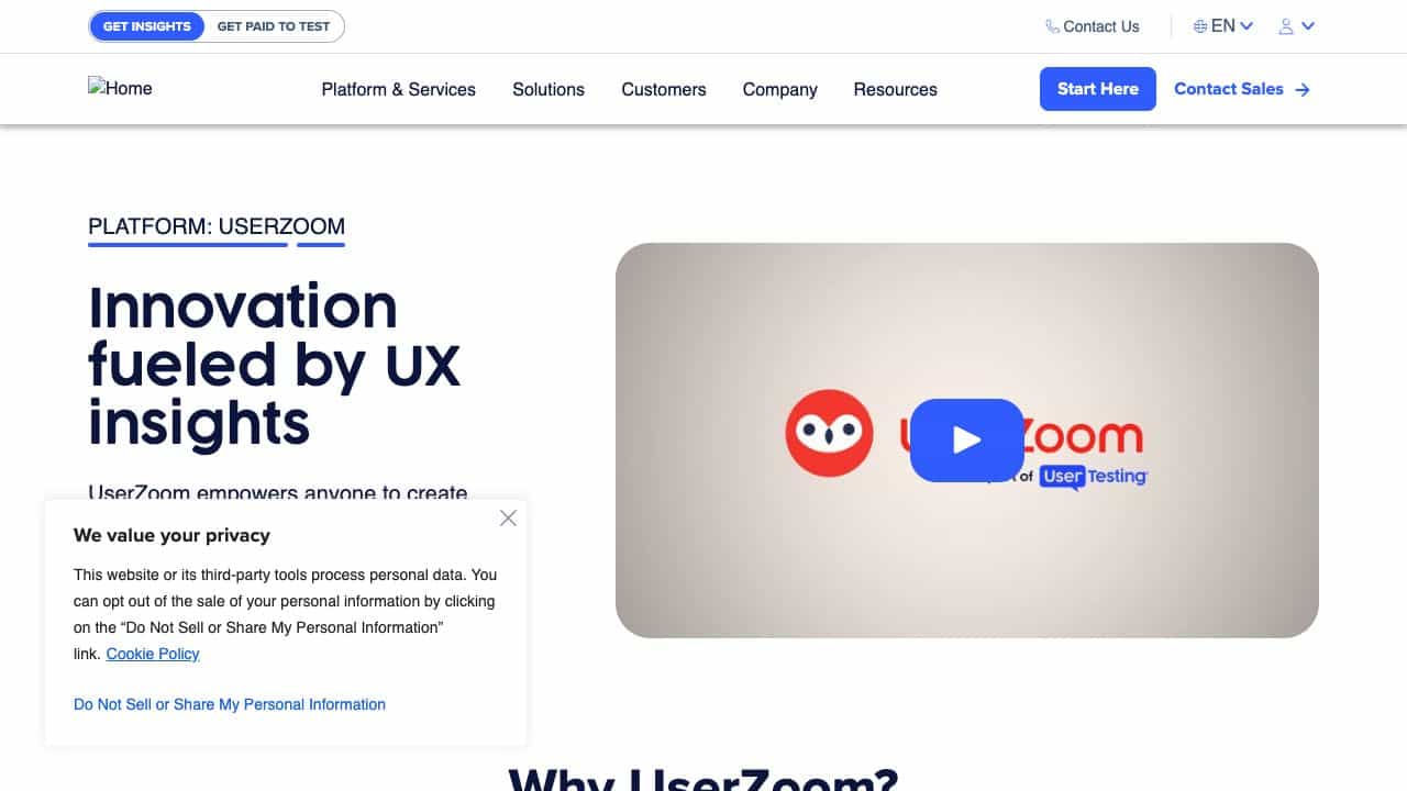 UserZoom is a comprehensive UX research platform that enables anyone to gather customer feedback through usability testing, surveys, and more, using a global participant network and AI-powered insights.