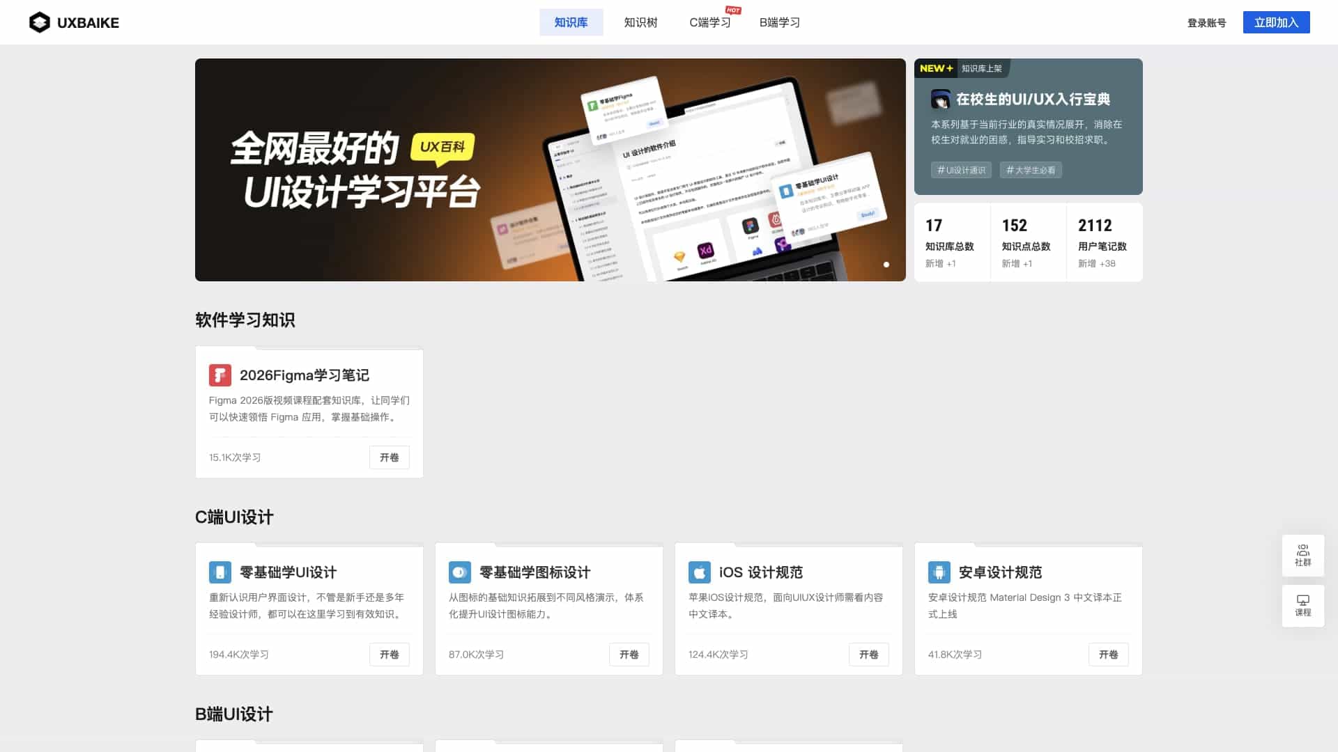 UXBAIKE is an online knowledge base providing structured learning materials for UI/UX design, including courses on Figma, design standards (iOS, Android), AI illustration, UX theory, and frontend design, aimed at designers and students.